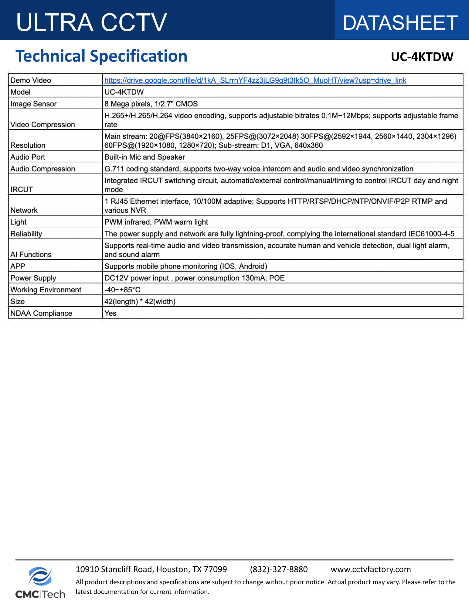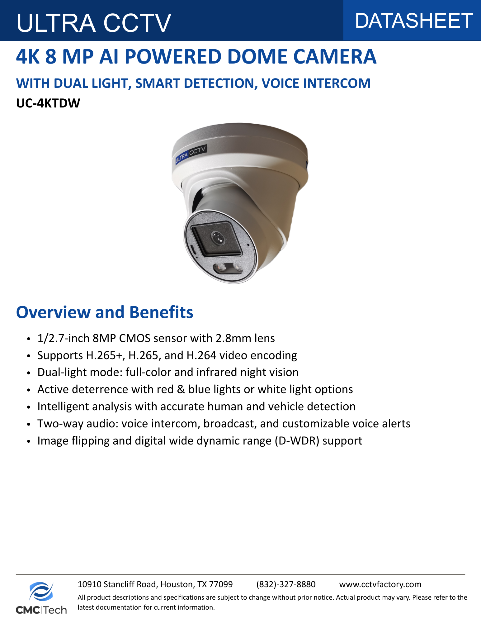CMC TECH Add to Cart 2K 4MP Smart Security Dome- DUAL LIGHT, MICROPHONE, SMART DETECTION MSRP: Was: Now: $59.00 Check out the video quality of this camera!Demo video The UC-2KTDW is a compact 4MP camera that deli…